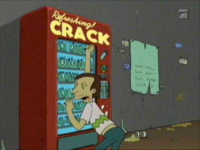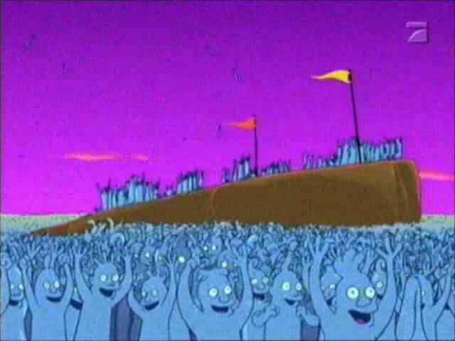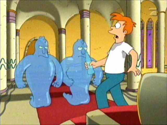 | FUTURAMA CUTS - SEASON 1 7: MY THREE SUNS THE ONE WHERE The crew visits a planet inhabited by liquid aliens. Fry, after delivering a package under the scorching heat of the planet's three suns, finds a bottle of cool blue liquid to quench his thirst. But when that liquid turns out to be the civilization's ruler, Fry finds he has become the new leader. Initially drunk with power, he soon discovers his life is in danger and must turn to his friends to help him dry out. [Foxworld Synopsis] -------------- DEFINITE CUTS -------------- FRY Hey, what'cha watching? BENDER (apprehensive) Nothing! LEELA Is that a cooking show? BENDER No, of course not. It was ... uh ... porno [Replaced by "uh" again]! Yeah, that's it. -------------- On Little Neptune: FRY So, this is Little Neptune? BENDER Yep. Every chef knows this is the place to get exotic gourmet ingredients. LEELA (cynically) Among other things. (what Leela is referring to is the vending machine in a nearby alleyway that says "Buy Refreshing Crack!" At the machine, a junkie inserts his money and awaits his prize, but the portion of crack gets stuck on its way down to the bottom. The junkie cries for the machine not to hold out on him like this, but it's no use, and he slinks down to the floor in anguish) [Credit - Peel's 'Toaster' & the Low-Bandwidth Futurama Site] |