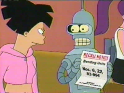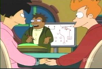 | FUTURAMA CUTS - SEASON 2 6: PUT YOUR HEAD ON MY SHOULDER (page 1 of 2) - C4 PREMIERE 07.08.01, 18:30 - uncut premiere 22.02.03, 01.15 THE ONE WHERE Fry and Amy have an 'encounter' on Mercury, but on a secluded picnic on Neptune with just Fry, Amy and Zoidberg, when Fry was planning to break up with Amy, their car crashes and Fry has to have emergency surgery - his head gets attached to Amy's body! Meanwhile, with Valentine's Day is coming up, Bender starts his own 'discrete and discreet' dating service. DEFINITE CUTS --------- After the advert for Malfunctionin� Eddie�s car store: AMY Hey! Let�s go car shopping. My parents promised if I got all Bs they�d buy me a bar. And I got all Cs! BENDER Mind if I tag along? I need to bring my ass in for re-servicing. (holds up �Recall Notice�) The recall notice says it could burst into flame in a low-speed collision. FRY No wonder you�ve been staying at the back of conga lines lately. LEELA I�ll get my coat. Coming, Bender? (taps his behind with the newspaper � his rear end lets off a short burst of fire and everyone gasps) --------- After Bender has seen his new �shock-absorbing bumpers� and demanded that they be removed: MECHANIC All right. But sooner or later that ass is gonna blow. And when it does, I just pray you�re not mooning someone you care about! --------- At Malfunctionin' Eddie's car store, Fry is approached by a salesman: SALESMAN No, the ThunderCougarFalconBird. Nothing makes you feel more like a man than a ThunderCougarFalconBird. So how much were you thinking of spending on this ThunderCougarFalconBird? FRY Sorry, I'm not here to buy. SALESMAN I understand, and it's wonderful that you don't care whether anyone questions your sexual orientation. FRY I care! I care plenty! I just don't know how to make them stop! SALESMAN One word: ThunderCougarFalconBird. --------- Fry and Leela are talking about how it's Valentine's Day soon: FRY Valentine's Day's coming? Oh, crap! I forgot to get a girlfriend again! --------- Fry and Amy tell the others about their �encounter�: AMY Well, we broke down on Mercury, and one thing led to another... FRY And it led there again when we got home! (they both laugh, Leela looks annoyed) BENDER Congratulations, Fry� |