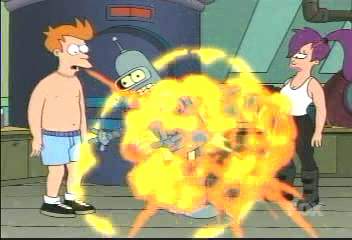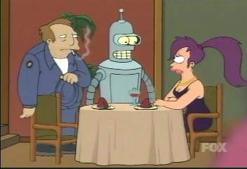 | FUTURAMA CUTS - SEASON 2 6: PUT YOUR HEAD ON MY SHOULDER (page 2 of 2) - C4 PREMIERE 07.08.01, 18:30 - uncut premiere 22.02.03, 01.15 DEFINITE CUTS --------- Later on, Bender's plotting to exploit lonely people on Valentine's Day: BENDER I have a plan so deviously clever that I- (Scene cuts to a courtroom - Bender is stopped in mid-sentence by a judge's hammer slamming down. Bender, Leela and two hooker-bots face the judge) JUDGE $500 and time served! BENDER Stupid anti-pimping laws! (to Leela) Well, pay the man! (he struts away) HOOKER-BOT 1 Bender honey, we love you! BENDER Shut up baby, I know it. (Cut to the outside of PX headquarters � inside Bender is putting up his 'dating service' sign on a door) BENDER Ah, computer dating. It�s like pimping, but you rarely have to use the phrase �upside your head�. LEELA Bender, this is stupid. Why would anyone come to you for romantic help? BENDER Hey, don�t make me go upside your head! --------- In the next scene: Hermes is trying to get into the cupboard where he thinks Amy and Fry are: ZOIDBERG Stop! If you interrupt the mating dance, the male will become enraged and maul us with his fearsome gonad! --------- Fry�s complaining about being �smothered� by Amy: FRY I�m doing my job, there�s Amy. I spend a few hours selecting a candy from the machine, there�s Amy. I wake up the morning after sleeping with Amy, there�s Amy! --------- At dinner, where Bender's matched Leela with bus driver Al: AL (shocked at Leela's appearence) Yeesh! (sarcastic) Nice eyeball, Eyeball. LEELA (in response) Nice ass, Ass. BENDER Ooh, sparks. (to Al) Buy her a rose and I guarantee she�ll put out. AL (sits down) Ah, I�ll take my chances. --------- AL Well anyways Leela, I�d love to take a whack at ya, but that 10:15 to Nutley ain�t going nowheres without yours truly behind the wheel. --------- Right at the end: Bender's ass starts to explode: BENDER Oh no! My ass! My beautiful aaassss! (mostly drowned out by exploding noises) --------- Thankfully, C4 have re-edited the episode, so those cuts are hopefully consigned to history. |