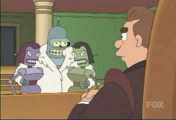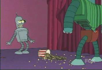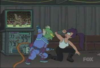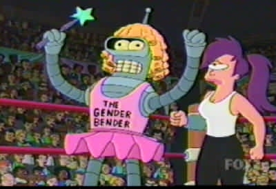 | FUTURAMA CUTS - SEASON 2 8: RAGING BENDER - C4 PREMIERE 14.08.01, 18:30 - uncut premiere 08.03.03, 01:15 THE ONE WHERE After appearing to have beaten up the robot-wrestling champion in a cinema, Bender becomes a robot wrestler and, trained by Leela, is an instant success. But when he abandons her and things turn sour, Bender has to change his in-ring image and become the laughing-stock of robot fighting. DEFINITE CUTS --------------------------- Bender makes the mistake of enraging robot fighting champion The Masked Unit: THE MASKED UNIT I�m gonna open a pile of whoop-ass on you! --------------------------- Later, when Bender is in the fighting league, he visits the owner and top fighters: BENDER Howdy chief. For my next bout, what do you say I fight these two bimbos in some mud? OWNER Actually, we�ve decided to go in a different direction. BENDER What if I told you we wouldn�t be fighting in the traditional sense? OWNER Bender, your popularity is slipping� -------------------------- MILLIONAIREBOT [As the Gender Bender,] You�ll be the most unpopular robot fighter since Sergeant Faeces-Processor! (laughs) BENDER Oh yeah? ------------------------- Robot Fighting League TV advert: NARRATOR You loved him as Bender the Offender. Now prepare to hate him as he threatens your sexuality in his new persona, the Gender Bender! --------------------------- During Bender�s championship bout, Leela and Fnogg (her sexist former teacher) are also fighting under the ring: FNOGG You were an excellent student � too bad I was a lousy teacher! (fights back � most of the punches and kicks by Fnogg are shown, but the last couple of punches, and Leela falling backwards, were cut out by C4) � because they don�t want to show violence by men towards women. That�s all very well, but why did they show the start of the fighting?) |