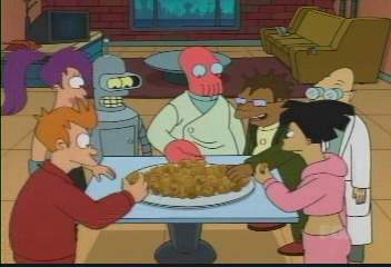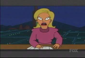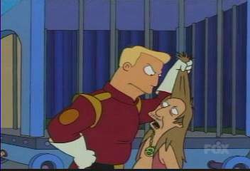 | FUTURAMA CUTS - SEASON 2 16: THE PROBLEM WITH POPPLERS C4 PREMIERE MAY HAVE BEEN IN OCTOBER/NOVEMBER 2001, AND IT WAS DEFINITELY SHOWN IN EARLY APRIL 2002 uncut premiere - 19.04.03, 03:00 THE ONE WHERE After running out of food on the Planet of the Moochers, Fry, Leela and Bender find a tasty food source on a planet 1 million miles from nowhere. They take this addictive food back to Earth, and Fishy Joe�s (a fast-food chain with almost universal coverage) start selling it as �Popplers�. But then it turns out that Popplers can talk, and are in fact children of the Omicronians! Who, of course invade Earth. DEFINITE CUTS (C4) ----------------- PX are all tasting the new food: HERMES Oh mon, I�m inhaling these things! You guys scored some primo stuff here! So now, according to C4�s Futurama censors, the word �inhaling� is now a bad word, whichever context it�s in! ----------------- In the middle of the news programme when the aliens arrive on Earth: (the ground starts shaking) LINDA (NEWSREADER) We seem to be experiencing technical difficulties� (a girder falls from the roof) and crap like I�ve never seen! (screen goes fuzzy) ----------------- Smelly Hippy has just informed the Omicronians that Leela has been replaced by an orang-utan: BRANNIGAN (has grabbed hippy) You�d sacrifice a beautiful woman to save a moderately attractive ape? You must have been smoking some bad granola. |