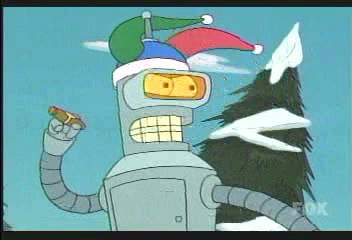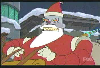| FUTURAMA CUTS - SEASON 2 4: XMAS STORY - C4 PREMIERE 31.07.01, 18:30 THE ONE WHERE At Christmas, or Xmas as everyone calls it in 3000, an actual (robot) Santa comes to town every Xmas Eve. But unfortunately his standards were set too high, and now he thinks everyone's been bad... DEFINITE CUTS -------------------------------- During PX's ski trip: SKI INSTRUCTOR (to Bender) Excuse me, sir, you�re snowboarding off the trail BENDER Lick my frozen metal ass! Ha ha ha, ha ha ha� (goes off the edge of the cliff) [Credit: Peel's Teral] ------------------------------- Well, I don't have all the cuts for this episode, but to jazz the page up, here's a picture of the evil robot Santa. |