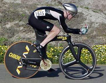 | But possibly the sport that has most felt the impact of carbon fiber is bicycling, both off-road and on. Carbon fiber is now used for the construction of everything from the frame to the fork tube spacers (rings that fit around the fork tube between the frame and the handlebars). One of the reasons that the use of carbon fiber is growing so rapidly is that the cost (both for the manufacturer and for the consumer) has been coming down steadily for the past few years. Below is a picture of a carbon fiber road-racing bicycle made by Lotus, a company that also uses carbon fiber in its motorcars and in its down-hill "soap box" race cars, some of which cost more than $100,000.00. | ||||||