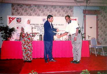 Prof. Dato' Dr. Mahamed Sharrif Presents to Musse "the Best Speaker Award for Students' Category During the 2nd International Conference on ICMS "Tropical Marine Environment".