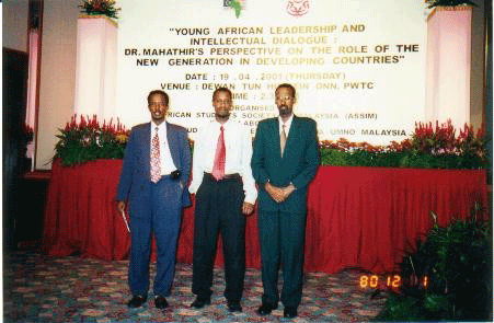 Musse, Shidane and Hassan Imaan attending posing a photo during 'Young African Leadership and Intellectual Dialogue" with Malaysian Premier Dr. Mahathir Mohamed Perspective on the Role of the New Generation in the Developing Countries at Wisma Putra, Kuala Lumpur