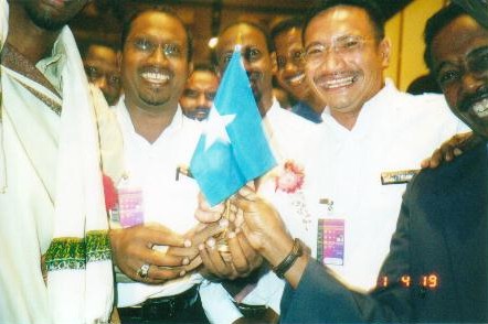 Dato' Hishamuddin Hussien Onn, Minister of Sports Malaysia and Dato' Dr. Zamri, an Executive Member of Ruling UMNO Party Raising Somali Flag while posting a photo during 'Young African Leadership and Intellectual Dialogue", Wisma Putra, Kuala Lumpur
