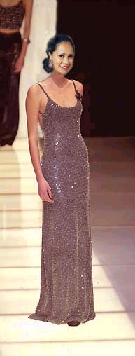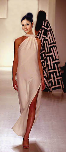 Jennifer Lopez look alike Miss Andrea Silverio strikes a note in a simple eggshell white evening gown provided by the classic lines of Halston. |