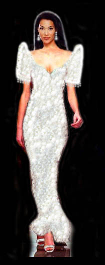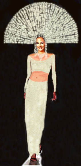 During the first try, I got the headdress right, thanks in part to the ever present handfan! Instead of cover-ing the top of the head with a veil, why not go modern and use a cascade of pearls instead? The veil in the original worn by a Muslim Princess is fine, but unfortunaltely Michelle is not going to a wedding! The first dress looked sexy enough, but still there was something wrong. The arms looked too bare and a bit scraw- ny so I decided to put some sleeves on and presto, a more elegant look! To my dismay, after looking at it some more, the second dress lacked the sexy appeal of the first. Too much of Michelle Reyes is covered! |