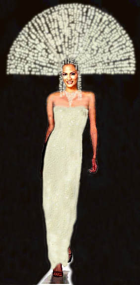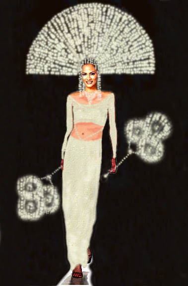 How do you achieve a sexy look without going too far? Since lowering the neckline was out of the quest-ion, baring a bit of her tummy achieved the sexy look but hardly indecent at all. The third dress was start- ing to look more and more of what I had in mind, classy and a bit naughty at the same time! The hands still seemed too idle for me. What does she do with her hands while parading in her national costume? Hold a broom? No, it's not Halloween. A sceptre perhaps? Michelle hasn't won yet. A spear? Hardly fits. A temptress she may be, but no huntress she will ever be! Why not have her hold oversize fans in both hands? Adds sense of movement, drama and flair & besides, she can always use it to actually fan herself! The fourth dress already has it all. Just a few more strands of pearls crossing over her bare tummy and it is all done! Miss Philippines is ready to strut her stuff on stage! Hold your applause please. . . . -Heimlich |