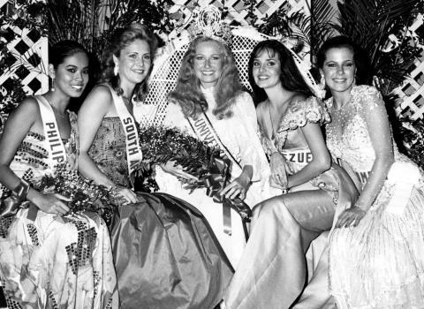 Desiree Verdadero almost won the crown in the 1984 Miss U- niverse Pageant. Having rank- ed second during the prelimina-ries, she was a huge favorite come pageant finals night. From left : Desiree, 3rd Run-ner-up; South Africa's Leticia Snyman, 1st Runner-up; Miss Universe '84, Yvonne Ryding of Sweden; Carmen Avila of Venezuela, 2nd Runner-up; and 4th Runner-up Susana Caldas of Colombia. |