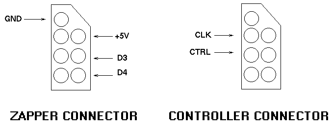 Del cable del Zapper sacamos +5, GND, D3 y D4, y del cable del control sacamos CTRL y CK. La señal de CTRL es común para ambos joysticks, pero la señal de CK es diferente para cada Joystick. Sin embargo, ¡Funciona! (Cambia un poco el rango de movimiento, pero aún así es mejor que el pad).