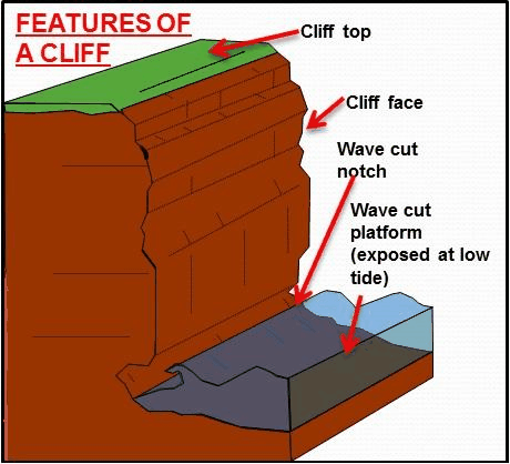 A cliff is a vertical, near vertical or sloping wall of rock or sediment that borders the sea. They generally differ in their angle of slope because of their rock structure and geology, but the processes involved in their formation are the same.