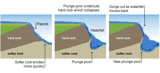 Waterfalls A waterfall is a steep drop in the course of a river. They form when a band of hard resistant rock (cap rock) lies over softer, less resistant rock. The softer rock is quickly eroded by hydraulic action and abrasion, causing the harder rock to be undercut. The hard rock overhangs until it can no longer carry its own weight. The overhang collapses and then breaks up in the water below. The great power of the water at the base of the waterfall causes a plunge pool to form. The bed of the river below the waterfall contains boulders eroded by splash back from behind the waterfall.