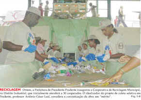 - Infra-estrutura - OO barracão foi construído pela Prudenco (Companhia Prudentina de Desenvolvimento), no Distrito Industrial, e tem como parceiros as secretarias de Assistência Social e do Meio Ambiente, Unesp, Unoeste (Universidade do Oeste Paulista), Central de Voluntários em Ação, Siemaco (Sindicato dos Empregados em Empresas de Asseio e Conservação e dos Trabalhadores na Limpeza Urbana de Presidente Prudente) e Fenascon. O local receberá o material reciclável para comercialização, com refeitório, sanitários, escritório, maquinário, esteira, alas para separação do material, além de equipamentos de segurança. Cooperados - Florindo Lagesbegmann é um dos que trabalhavam no lixão e que agora poderá usufruir do barracão que abriga a cooperativa. "Eu sobrevivo da coleta. Há mais de um ano trabalho no local", afirmou. "Estava desempregado e vi esta opção como fonte de renda", completa, informando que sua renda mensal é de R$ 300,00. O pai de família Ademar Lourenço de Oliveira há um ano trabalhava no lixão, que será transformado em aterro sanitário. "É o meu serviço. As melhores condições irão fazer com que eu trabalhe dignamente", cita. Lixo de Prudente deve ser reciclado em 100%
