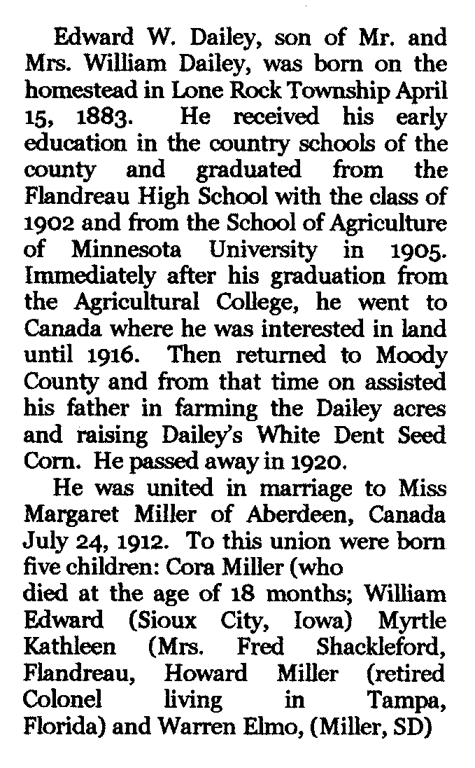 The Dailey family clearly valued higher education. Both Will Dailey and his brother, James, had been educated after their high school graduations in Iowa seminaries and Will went on to become a teacher in Iowa before moving to establish a homestead in South Dakota in 1876. After their graduation from high school, he sent his own sons to the University of Minnesota School of Agriculture before they set out to farm on their own. Edward Dailey graduated in 1905 from the university which was located in St. Paul and moved immediately afterwards to Canada where he lived until 1916 when he moved back to the family farm with his Canadian wife, Margaret Miller and their four children. (One wonders if there was any connection between Thora's pregnancy and Edward's move to Canada. Another question which may never be answered.) Edward died in 1920 of pneumonia at age 37, leaving his widow and four young children.