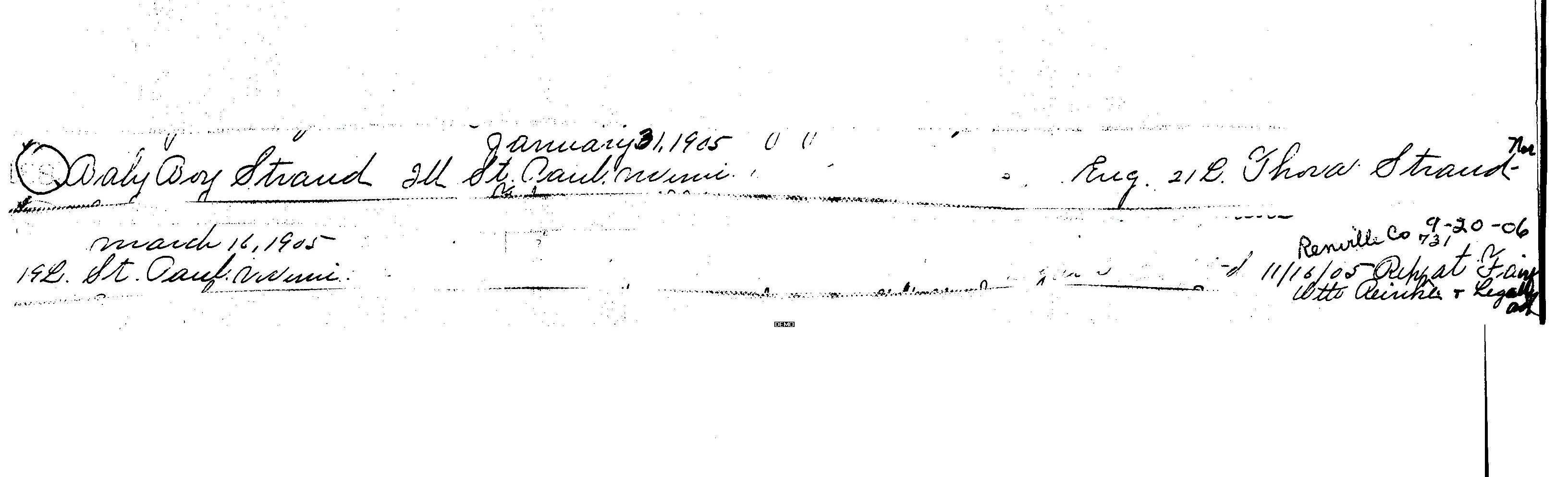 The baby boy was placed about five weeks later, on March 16,1905, at the Children's Home Society in St. Paul, Minnesota where he was recorded as Baby Boy Strand, 111 [illegitimate?] whose mother was Thora Strand, Norwegian and whose unnamed father was English [sic]. (In the CHS's old record book, the baby's date of birth is also different from the birth certificate and is listed as Jan. 31,1905 and the parents' ages seem to be completely wrong, too. In a phone conversation with Janet Jenkins, a current employee of the CHS suggested that Baby Boy Strand was first "placed in May with a family and for a reason which was not noted, he was later replaced with the Reinke family who later adopted him legally." I am left with questions about this first placement since no record of that was given to me.)