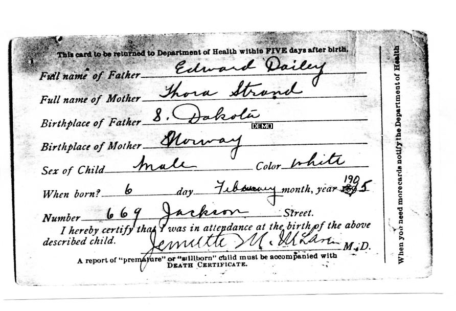 Those are the facts, but there was another fact, however, that remained unknown for almost 100 years. This fact is that Thora Strand gave birth to a baby boy on Feb. 6, 1905 in St. Paul, Minnesota and on his birth certificate Edward Dailey from South Dakota was listed as the father.