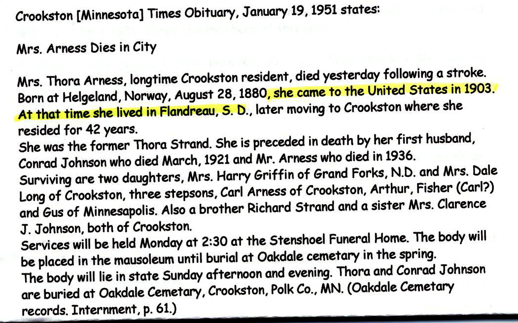 By 1906, Miss Thora Strand has moved to Minnesota and is listed in the town directory as living at 316 Minnesota Street in Crookston, the home of her brother Richard. By the 1910 census, Thora Strand is living as a domestic servant with the David Miller family in Angus Township in Polk County, Minnesota. Also living with the family as a boarder with no occupation is Thora's brother Thomas, who had been crippled six years earlier in an accident at work in which a rail car had fallen on him. (Thomas died in 1914 at age 38.) Thora married Conrad Johnson in 1910 and they had two daughters. Helen Alvina was born in 1910 and Cora Teresa was born in 1911. Thora died in 1951.