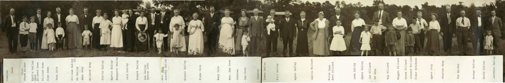 Panoramic photo of a Dunn / Dailey family get together, about 1919