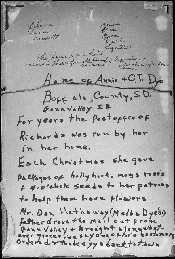 Annie did what she could, managing the home, gardening, selling farm produce and keeping the Post Office, Richards, SD, in her house for eleven years. Here they reared nine children: