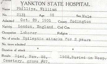 On 28 OCT 1901 William was found by the Codington County, SD Commissioners of Insanity to be insane and was involuntarily committed to the SD State Mental Hospital at Yankton, SD where he was found to be suffering from epilepsy, probably traumatic epilepsy brought on by a kick to the head from a horse. According to hospital records he was short tempered and irritable. He was described as 5 feet 4 inches tall and muscular.
