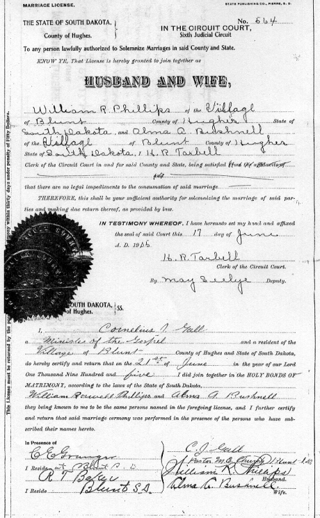 Alma Bushnell / William Roswell Phillips, Primary Record of Marriage