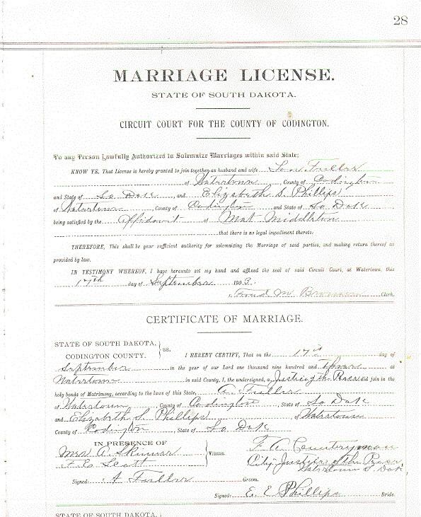 Eliza Esther Marriage Phillips / Lon Fuller, Primary Record of Marriage