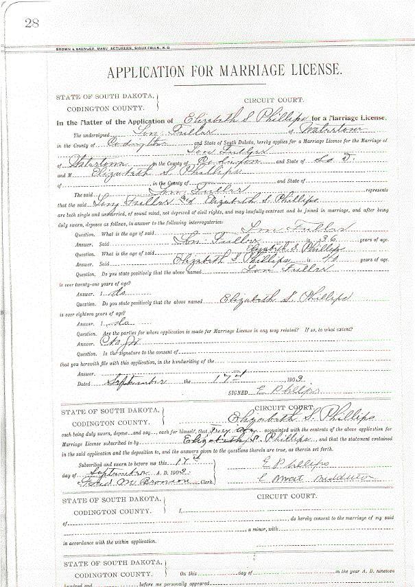 Eliza Esther Marriage Phillips and Lon Fuller, Application for Marriage License