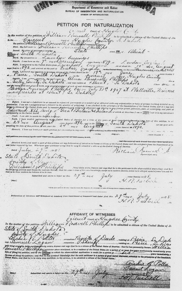 William Roswell Phillips, Primary Record of Naturalization