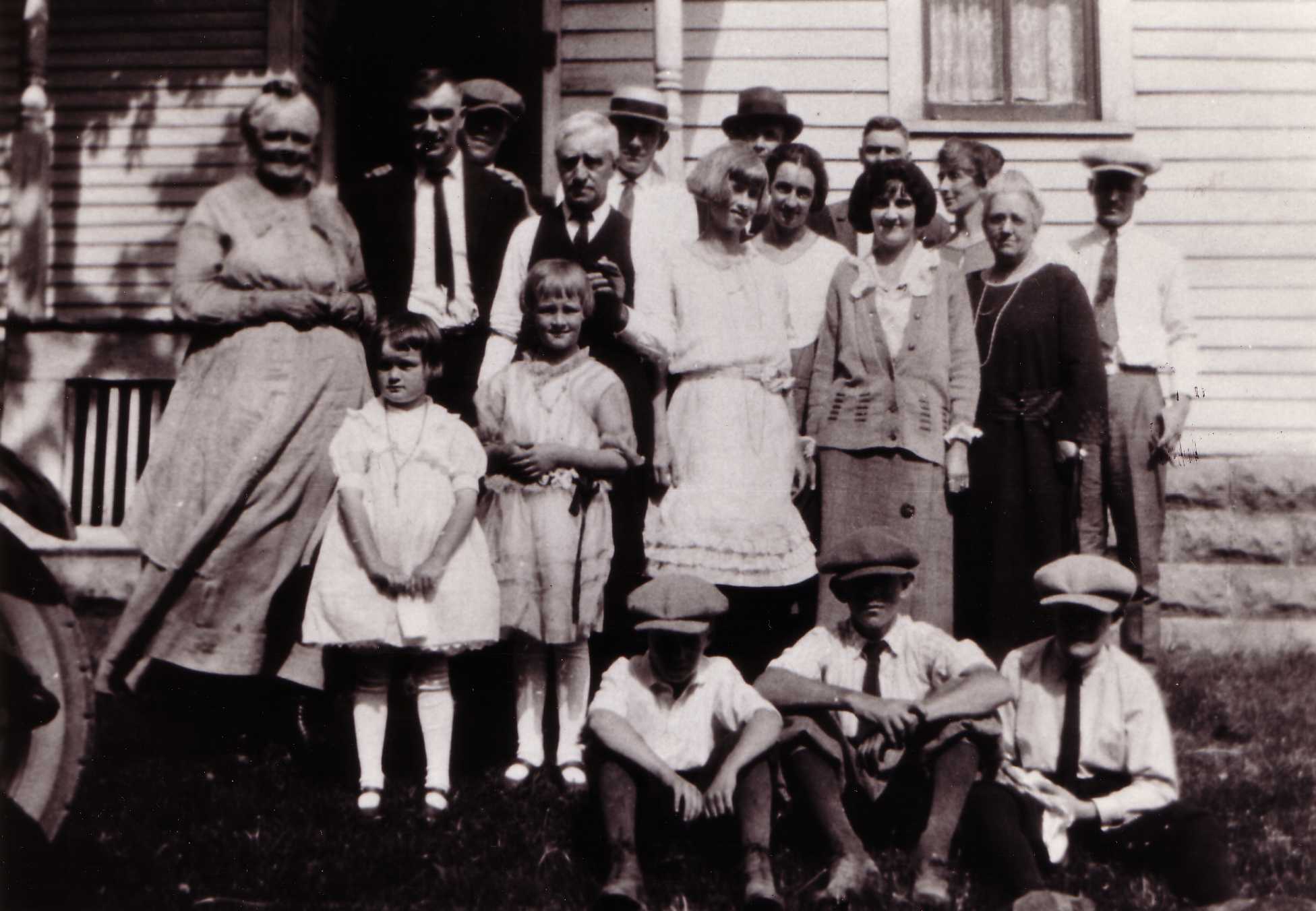 Back row: Antje Slotemaker Schaap, Arie Schaap, his son Gary (behind), Cornelius Molhoek, Julius Pomp, Walter Clauden, Anna Schaap Molhoek, and Harvey Cook. Second row: GERRIT SCHAAP IIIC (camera shy, very few pictures of him), Helen Cook McNitt, Grietje Schaap Pomp, Betty Schaap Clausen, and Martha Stoddard Schaap. Girls: Loraine Pomp Widman and June Pomp Mack. Boys: Garrett Cook, Edwin Schaap, and John Molhoek.
