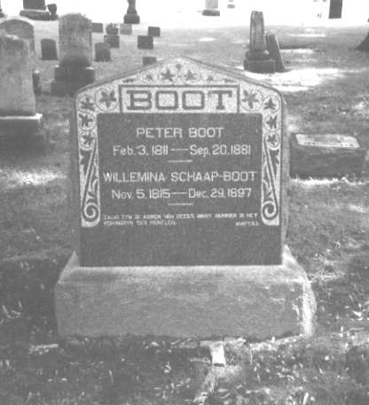 I. Willemina Schaap, born 05 NOV 1815 at Wieldrecht, Netherlands; died 29 DEC 1897 at Holland, Ottawa, MI; married Peter Boot, born 03 FEB 1811 at van Zevenbergen, Netherlands, died 20 SEP 1881 at Holland, Ottawa, MI. They had seven children, Gertrude, Otto, Anna, Pieter, Willemina, Arie, and Teunis. |