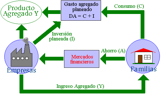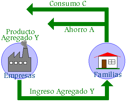 En cualquier momento existe una equivalencia exacta entre producto agregado (producción) e ingreso agregado. En un periodo dado las familias reciben un cierto ingreso (Y). El ingreso disponible (Yd) sería igual al ingreso agregado (Y). Suponiendo que no existe gobierno (es decir no hay impuestos, ni gasto del gobierno) y la economía es cerrada (no se exporta ni se importa), entonces una familia sólo tiene dos posibilidades para emplear su ingreso: consumir (C) o ahorrar (A).