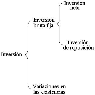 La inversión está entonces compuesta por la inversión bruta fija y por las variaciones en las existencias o inventarios. Así la inversión bruta fija o formación bruta de capital consiste en la inversión neta más la inversión de reposición. La inversión neta es la adquisición de nuevos bienes de capital por parte de las empresas, mientras que la inversión de reposición consiste en reponer los bienes de capital ya depreciados. Por otro lado las variaciones en las existencias consiste en los incrementos en los inventarios de producto terminado.