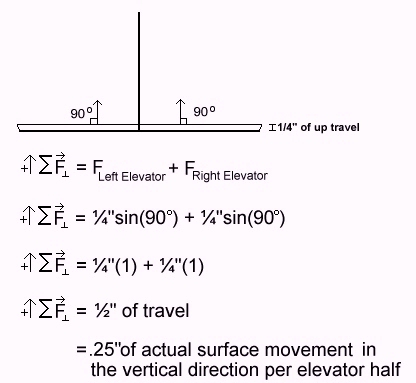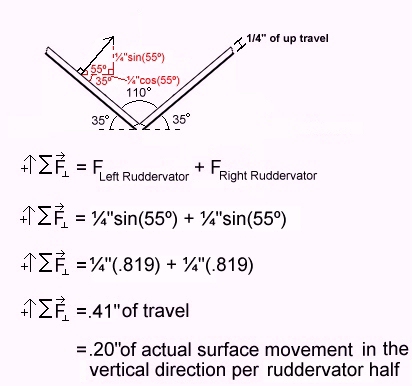 | These are drawings to show the efficiency of the two different tail configurations. Because the V-tail is not deflecting directly up, it has counteractive yaw. The right ruddervator gives some left yaw, and the left ruddervator produces some right yaw. This is a waste of control surface movement because it isn't doing anything. As the physics shows, the conventional tail is more efficient. It actually has 125% the authority of a V-tail. This means less travel is needed on a conventional tail. This means less drag, which causes less loss of speed in the turns. |