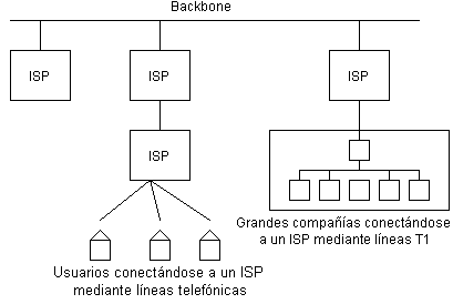 Los ISP se conectan a otros ISP más grandes, y éstos mantienen conexiones de fibra óptica llamados "backbones" (backbone significa columna vertebral) para una nación o región. Los backbones están conectados alrededor del mundo mediante cables submarinos o conexiones satelitales (vea esta página para un diagrma de conexión de backbones). De esta forma cada computador en Internet está conectado con los demás.