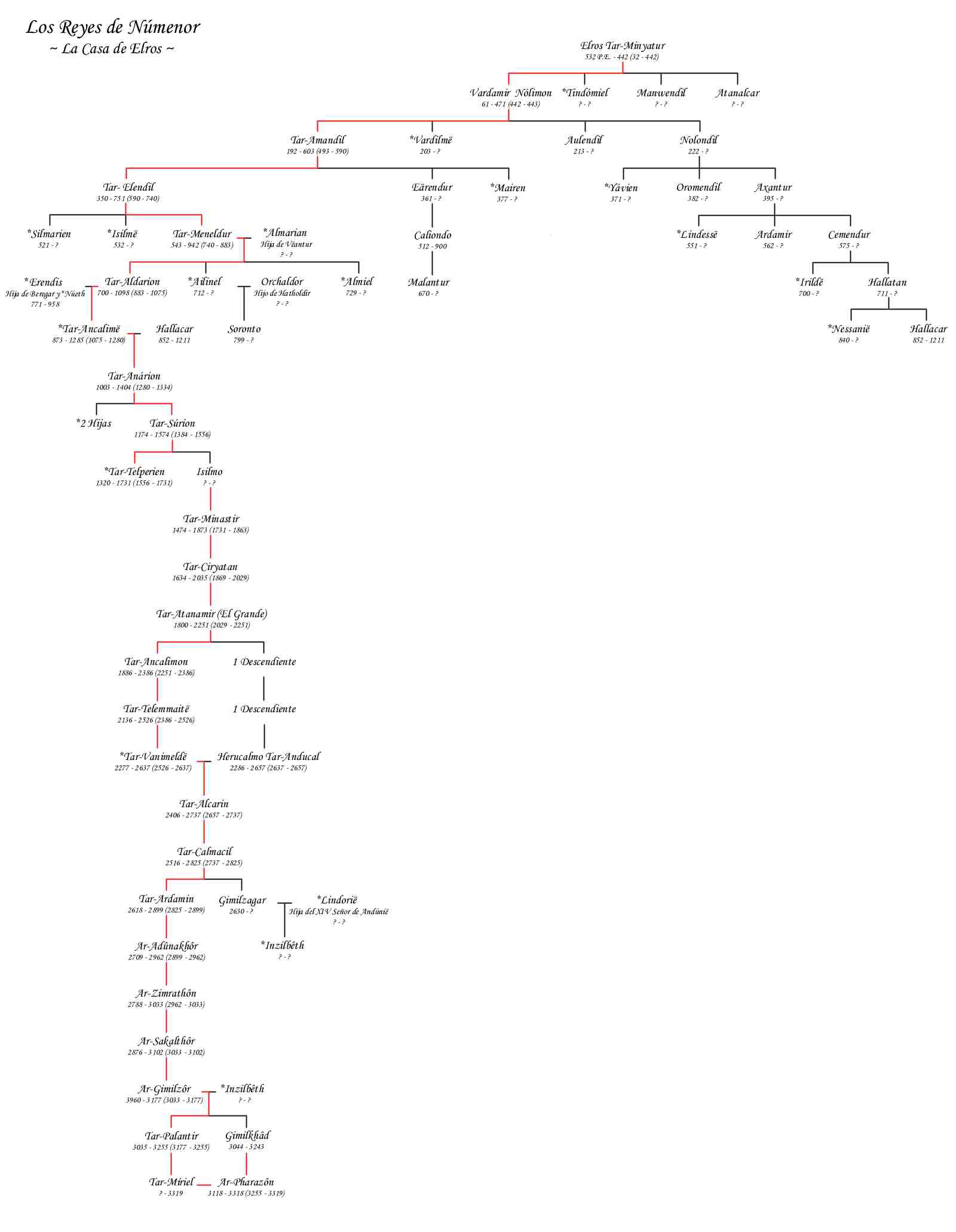 | Reyes de Númenor | Genealogía de los Reyes de Númenor, descendientes de Elros, hermano de Elrond el medio elfo |