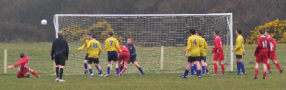 (08/12/07) In what was likely the only game of football to be played on Anglesey today both teams should take great credit for a battling performance. Martyn reports: Despite playing against a fierce wind Glantraeth constantly put Denbigh Town under pressure and after 35 minutes a low shot from outside the box saw Scott Hughes beat the diving keeper to make it 1-0. Thats how it stayed until half time. In the second half again Glantraeth made all the early running and persistance by Matti Jones saw him get to the ball before the opposition keeper and guide it into the net 2-0. The boys then forgot everything the manager had told them and decided to take the sky route which saw the ball drift everywhere, this followed a disputed free kick which some thought should have gone the other way. From the resulting free kick the slippery ball went through the keeper's gloves and the pressure was on. 10 minutes from time Denbigh equalised having got a lucky rebound from a clearance, this time Paul Evans in goal had no chance 2-2. This shocked the boys into life and saw first Jamie Aston shave the cross bar, Scott Hughes and Sean Davies going close and from a corner a scramble and from a header from Ben Hull the visiting keeper tipped the ball over. Extra time again saw pressure from the home side with very few attacks really troubling Paul Evans. The second period kicked off and within seconds the ball was played back to Carl Edwards who hit the ball high with the wind the ball bounced and deceived the keeper who was then in a race with Scott Hughes who was following up to tap the ball home. Thats how it stayed to the end with both teams having a few chances. However with the rain and the wind falling the final whistle went and both teams congratulated each other. NB: In the next round Glantraeth are now away to Bontnewydd or Holyhead Hotspur Peibio who play next Saturday.