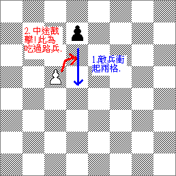 二、如果剛剛經過了己方兵所控制的格子,那麼可以把己方兵放在該格上,然後把敵兵拿走。此稱為「吃過路兵」(法文為「en