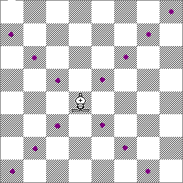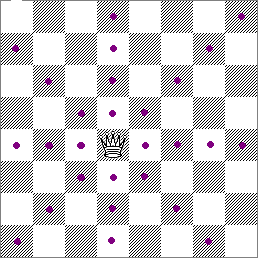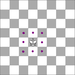 可向任何方向走一格,包括 斜走。如圖中所示,王可以走到紫色點的方格中。