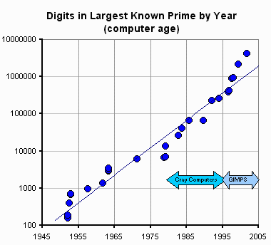 (上圖解釋 GIMPS 及微電腦出現後,尋找大素數的進一步躍進。)