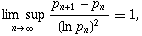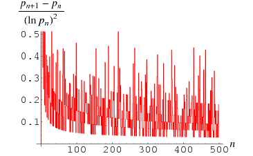 式中的 Pn 是指第 n 個素數。上式的意思為對任何兩相鄰素數而言,其差 (即素數間隙) 與小素數的自然對數 (Natural Logarithm) 值的平方的比不多於 1 。