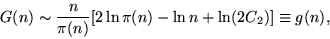 式中 p(n) 為素數計算函數 (Prime Counting Function),即不少於 n 的素數個數;C2 為孿生素數常數 (Twin Primes Constant) ,即