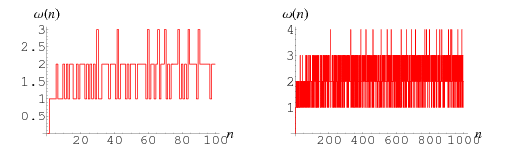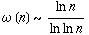 下圖顯示獨特素因子個數 w(n) 與 n 的關係: