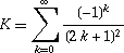 卡塔蘭常數 (Catalan's Constant) 在組合數學 (Combinatorics) 很常用,我們常以 K 表示。其定義為: