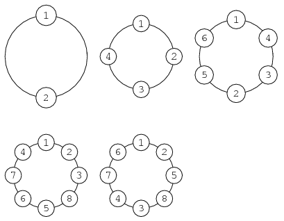 而現在我們只考慮當 m 為偶數 ,即 m = 2n ,及當中的一些特殊情況。其實當用 2、4或 6 個整數來作素數環也只有一個排列方法,而用 8 個數字則有兩個不同的排列方法 (如上圖)。到底對每一個 n 而言,有多少個不同的排列方法呢?
