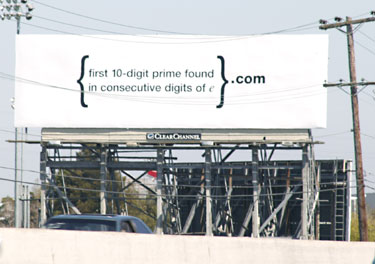 這廣告在美國矽谷 (Silicon Valley) 出現,說些什麼?括號中的問題要求找出首個存在於 e 內的連續十位素數。然而廣告沒有下款,也沒道明來意和相關貨品,所為何事呢?看得全美國人一臉迷惘,有的一走了之,也有不少人真的試試看,找尋那 e 中的素數。
