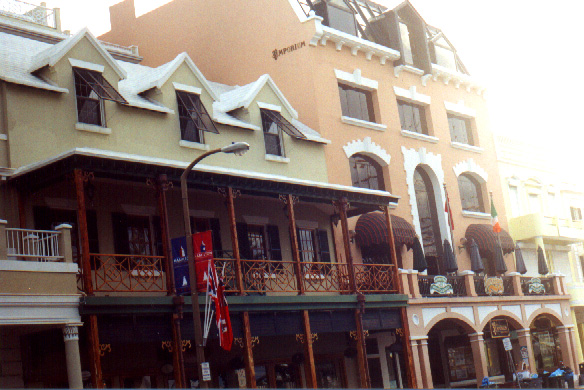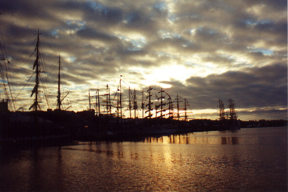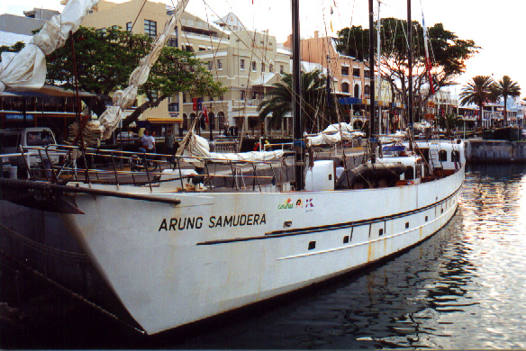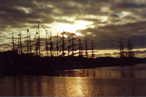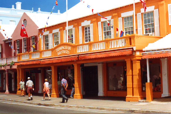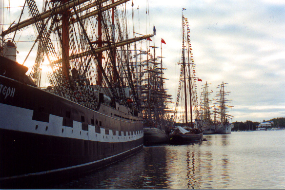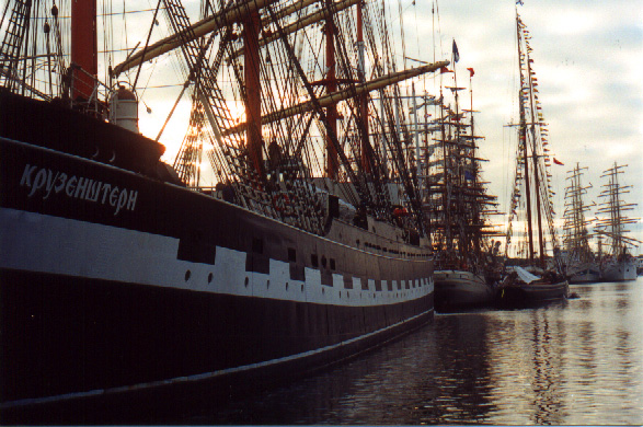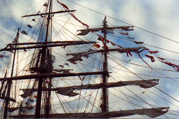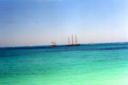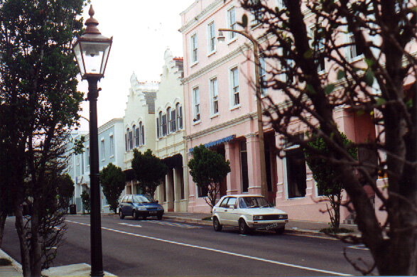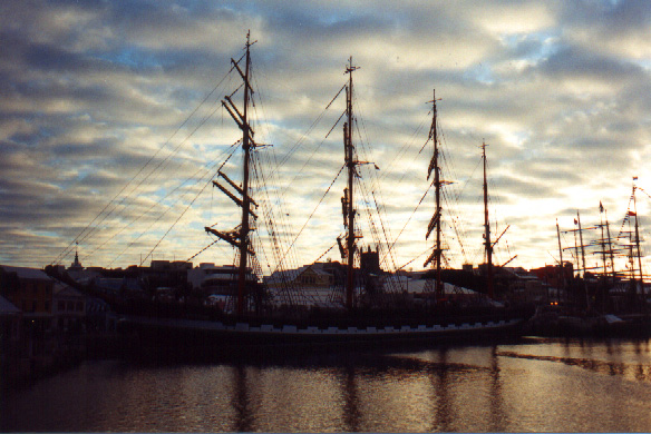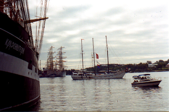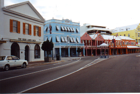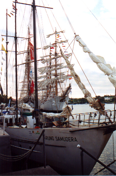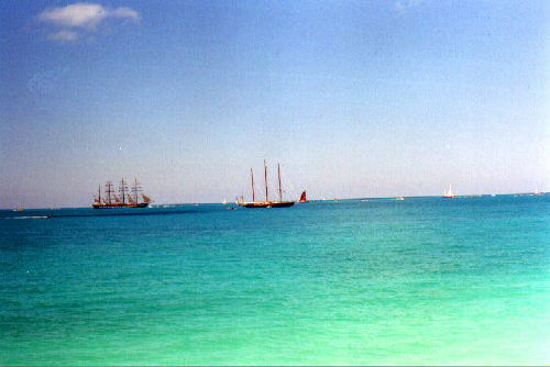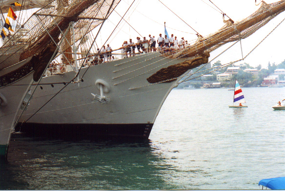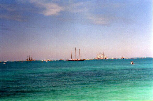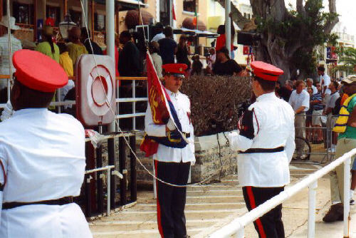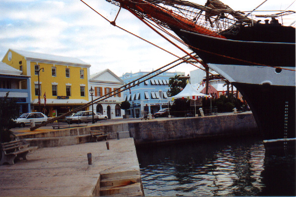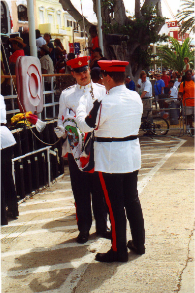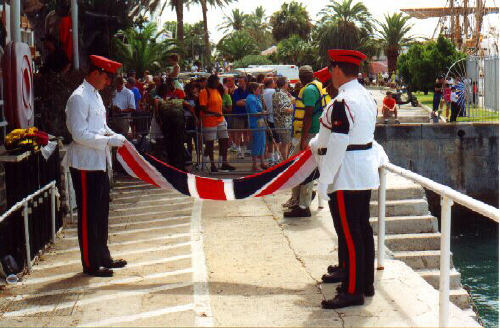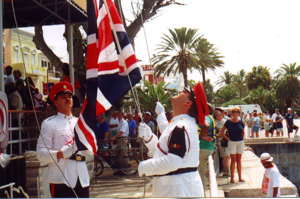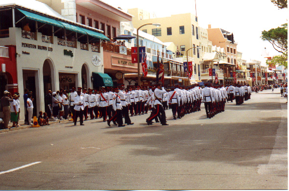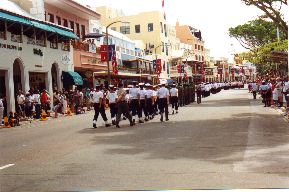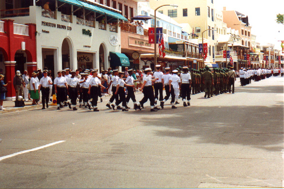 | In 2000 Bermuda was again a staging point in a trans-Atlantic tall ships event, this time celebrating the turn of the millenium. The ships were collected densely together in berths along Front Street, in Hamilton. A number of events and activities were planned locally to commemorate the event, but-presumably by co-incidence- the most notable was the simultaneous occurence of the annual Queen's Birthday Parade with the departure of the fleet. The Queen's Birthday is not actually officially celebrated on the date of her birth (), but on the 21st May. Many of the ships had already left their berths to assemble for their procession out of the Great Sound when naval and military squads began to assemble for their own procession along Front Street. Numbers of vessels remained on the wharf, however, and the parade was framed by these and watched by their crews, which looked down on the assembled audience of dignitaries, visitors and residents. Although the day began with a grim, overcast demeanour, by the time the troops marched off the sun had begun to show its face and the procession of the tall Ships along the North Shore was lit to advantage. The Queen's Birthday Parade This begins with the marching on of the sailors and troops. Normally, a detachment has in past always been provided by a Royal Naval vessel (rather than by the HM Naval Base on Ireland, HMS Malabar). As this is the senior service, it will be noted that they always march at the head of parades. At the Rememberance Day parade, the RN detachment always takes its position at the right, front of the assembled units-the senior position. On the narrow confines of Front Street that sort of two-dimensional placement is not possible andd they take the right of the line. This writer, oddly, cannot remember if a RN detachment was actually present this year. It has been the practice of the navy to ensure a vessel, and its detachment, are always present for certain parades, but this may not have been possible in 2000. HMS Malabar closed in 1995, ending two-hundred years of permanent naval establishment here, and leaving only the Sea Cadet Corp to represent the White Ensign. The Bermuda Regiment really run this parade, though. All the participants are rehearsed for it under thee regiment's RSM, and the Colour Party of the regiment takes central place, facing the Corporation of Hamilton's flagpole, and the dais holding the dignitaries. At the start of the parade the national flag (the Union Jack-not the red ensign with the distinguishing arms of the colony,) is flying from the Front Street flagpole, as it normally does. On the arrival of the Governor, however, it is lowered and replaced with his standard (the Union Jack, with the distinguishing arms of the colony on a white centre). This in turn is removed and replaced with the Queen's Standard to give indication of her symbolic presence (she's not been actually present for a Birthday Parade, yet). At the parades end, this order is reversed, to leave the Union Jack. Photographs Click on thumbnails for larger views. Photographs are arranged in chronological order. A page of Black and White images will be added. |