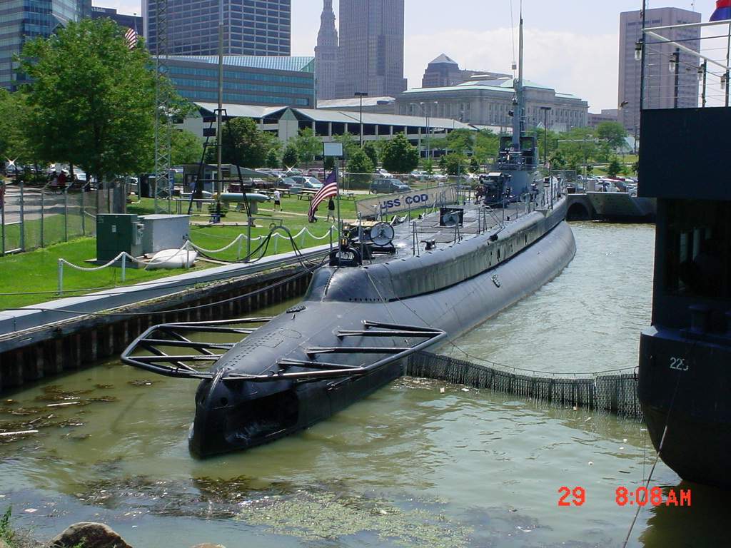 | Cleveland, Ohio is another one of those communities with the foresight to see the value in preserving our nations naval heritage. Many WW II Fleet subs were the lucky recipients of the legendary Cleveland built General Motors diesels, and the COD was no exception. The citizens of Cleveland also acquired a fine example of a GATO sub with a colorful and important history. The COD is an Electric Boat Company fleet Sub from Groton, CT, like the COBIA in Manitowoc. She sailed 7 war patrols and is credited with sinking 12 ships. The COD is also famous for conducting the only known international sub-to-sub rescuce operation, when she took on the crew of the Dutch submarine O-19. The O-19 had run agound on a coral reef in the South China Sea. COD took on her crew of 56 |