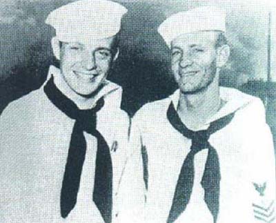 Patient, Fireman 2nd Class George Platter on Left. Famed "surgeon", Pharmacist Mate 1st Class Thomas Moore on right. |