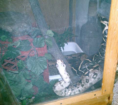 Here's Scout, my 8 ft Boa. He enjoys sleeping, eating, and napping on his sun rock. He is the oldest pet we have (he was adopted from my friend Wendy's brother, MD), and the best behaved. He is a mommy's boy, but really he loves anyone who is brave enough to take him out of his cage for some attention. His favorite place besides his bed is the bathroom. He likes to hang out on the shower curtain when the hot water is running and take a steam bath. Of course, the problem is getting him down. Even though you can't see it in this picture, Scout has some cute markings around his mouth that look like a moustache and goatee. Even people who do not like snakes have said that he is the sweetest and most beautiful snake they have ever seen. Mommy is so proud... |